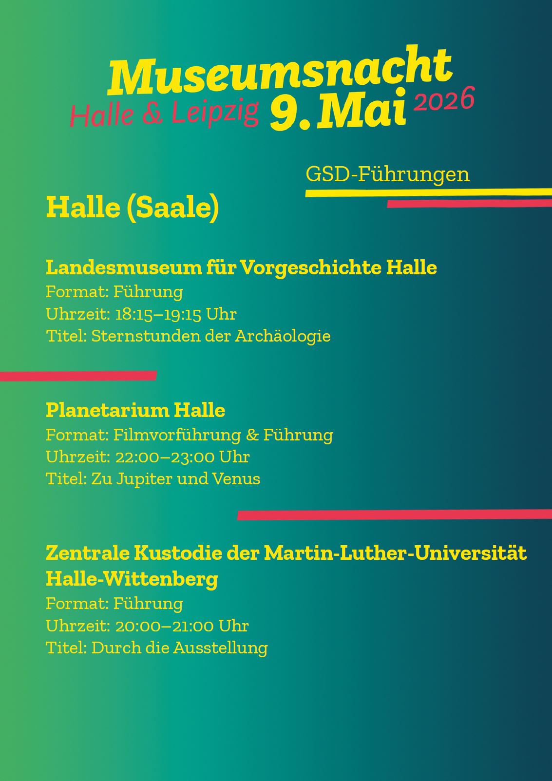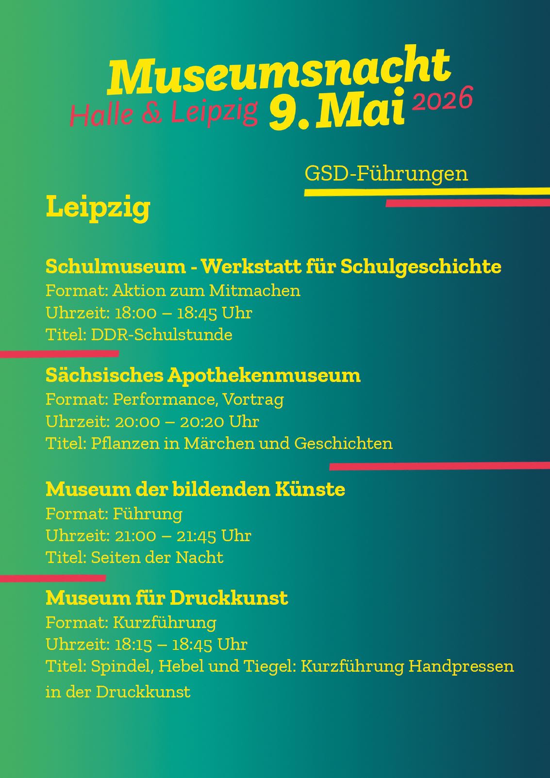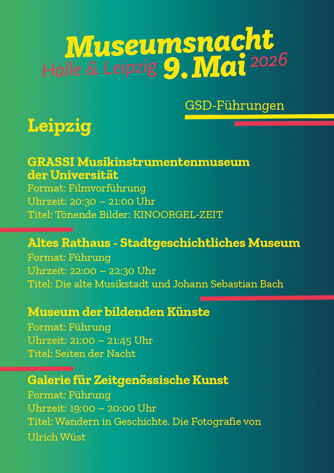 Zusätzlich gibt es eine limitierte Anzahl von Plätzen für eine „freie GSD-Führung“: Eine Person kann sich eine Führung auswählen, die sie besonders interessiert – auch wenn sie nicht bereits als GSD-Angebot gelistet ist (wir versuchen das dann möglich zu machen). Anmeldung dafür bis 24.04. per E-Mail an museumsnacht(at)leipzig.de.